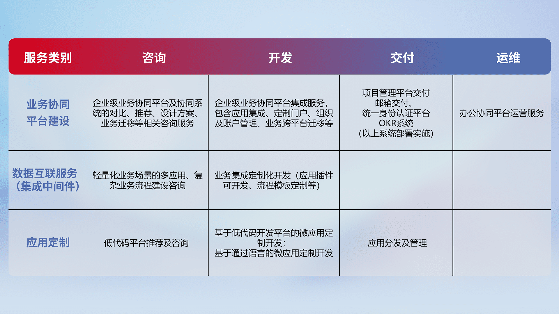 针对钉钉、、、企微、、、IDaas等平台级产品提供产品的规划、、、、方案、、、、交付、、、定制化开发等服务,,,,实现如统一协同办公、、智能客户服务、、、、混合会议管理、、智能数据查询、、等业务场景,,,实现数字化转型。。。