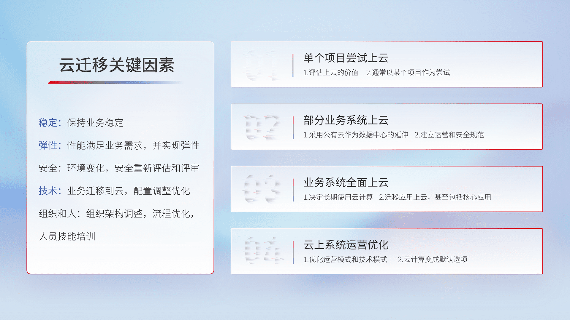 结合实际业务,,,,从规划设计、、、、云平台选型、、、、云原生改造、、、、数据迁移、、、、集成交付,,,迁移全过程为客户识别最佳上云路径,,做好风险识别管理,,,设计网络架构、、、、身份权限、、、、安全审计合规、、、、操作审计、、日志审计、、、、监控告警策略、、、、多站点容灾设计等,,,,对云上基础设施进行整体规划,,,,提升IT治理水平,,,以满足弹性、、、、高可用、、高性能的需求。。。